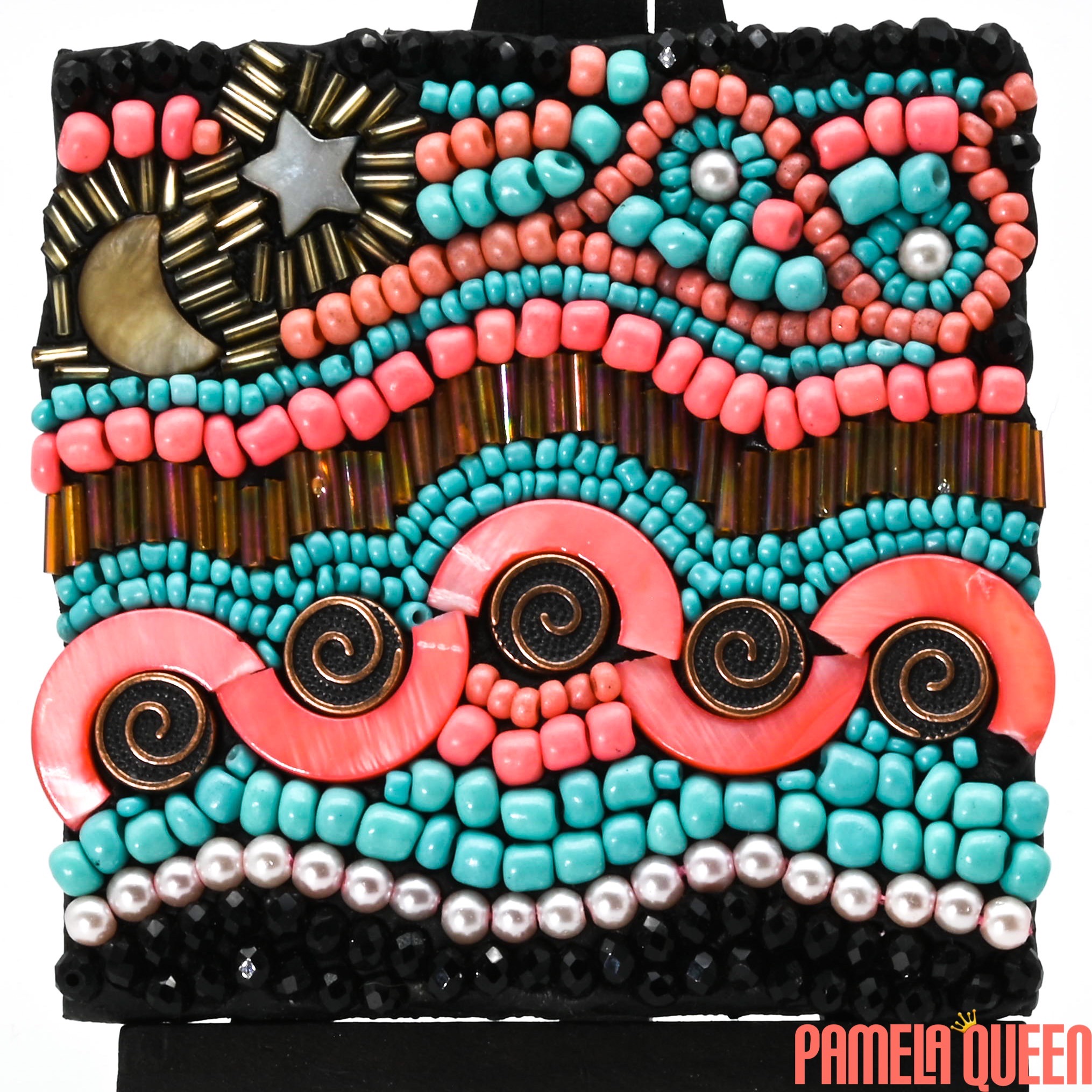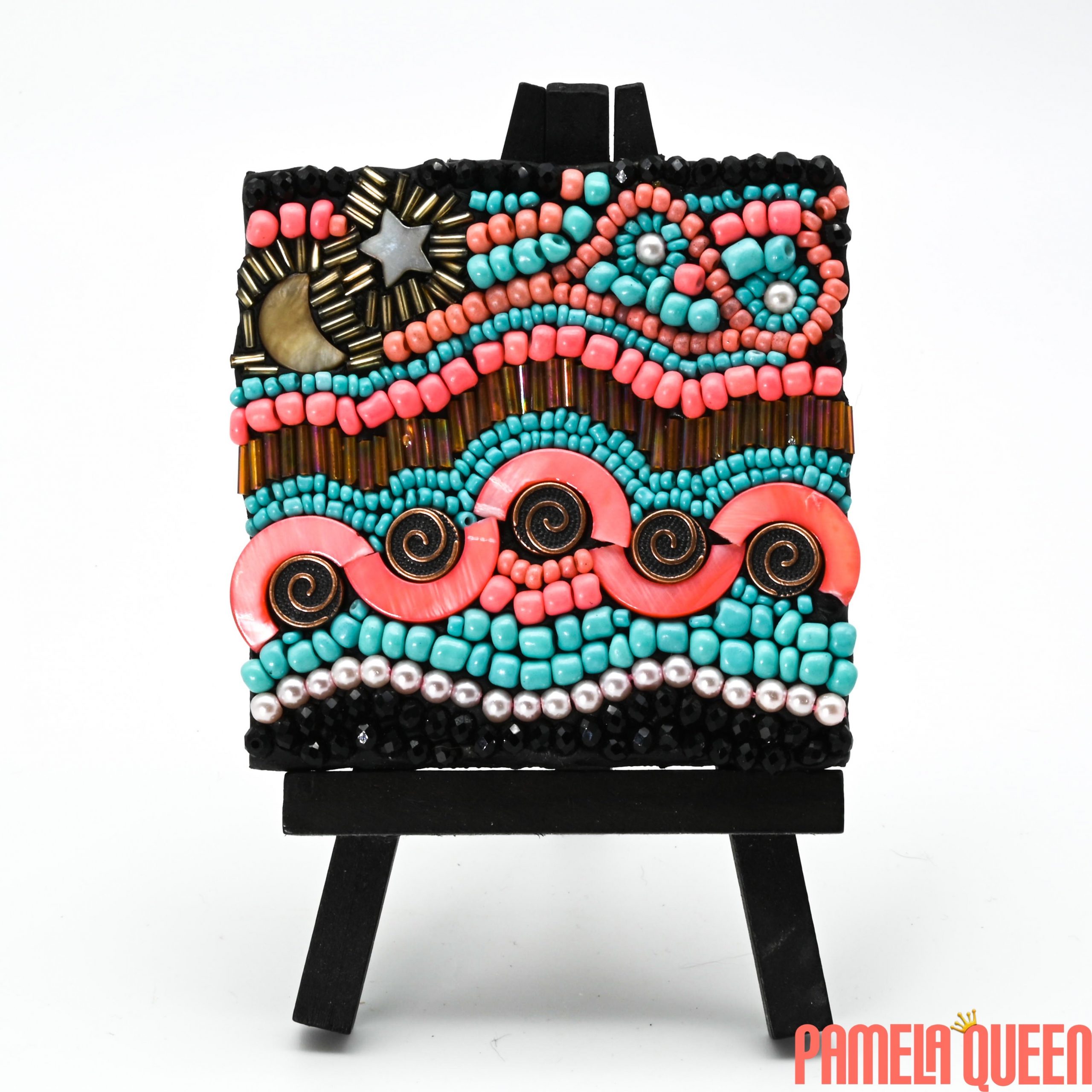 ★ DESIGN: Hand made, mixed media piece features a mix of glass and acrylic beads, shells, pearlized beads, and charms on a 3″ canvas displayed on a black “mini” easel.